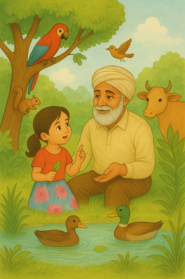 “हाँ बेटी,” दादा जी बोले, “ये सब हमारे सबसे पुराने दोस्त हैं। पेड़ हमें साँस लेने की हवा देते हैं, फल और फूल देते हैं। पशु हमारा साथ निभाते हैं, हमारी खेती-बाड़ी में मदद करते हैं। और पक्षी — वे तो हमारे संगीतकार हैं, जो हमें हर सुबह जगाते हैं।”